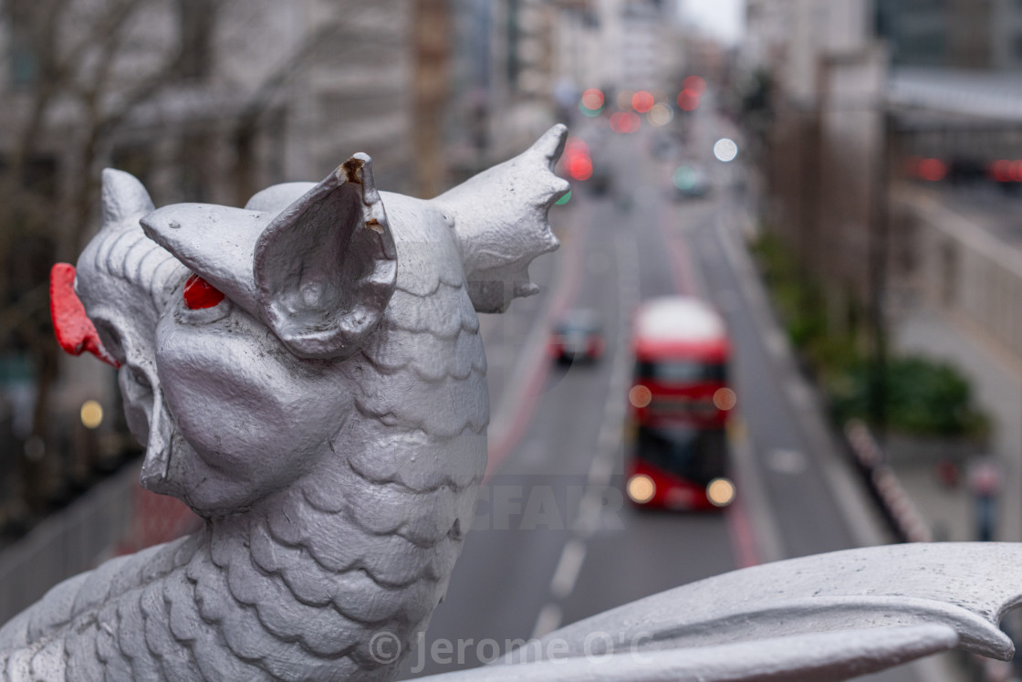 A London bus approaches the dragon on Holborn Viaduct. December, 2025